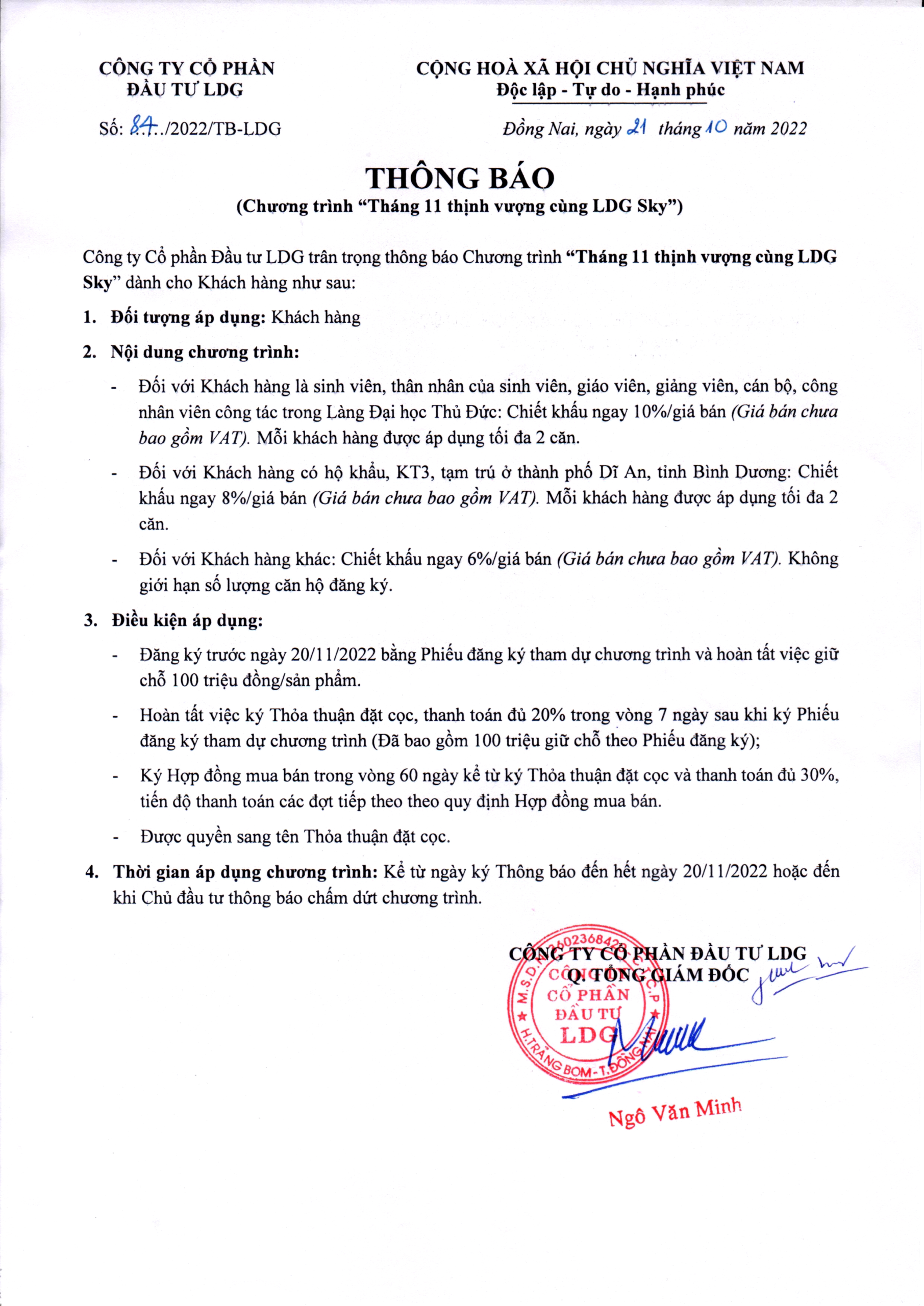 LDG Sky là dự án căn hộ cao cấp do LDG Group phát triển, tọa lạc tại khu đô thị mới Bình Nguyên – khu vực cửa ngõ phía Đông TP.HCM, thuộc TP. Dĩ An, Bình Dương. Dự án được định hướng trở thành khu căn hộ hiện đại kết hợp không gian sống xanh, đáp ứng nhu cầu an cư và đầu tư trong khu vực có tốc độ đô thị hóa nhanh.